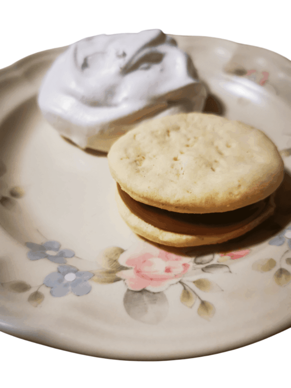 Elaborado en base a almidón de mandioca y de papa, huevo, aceite de oliva, goma xanthan y azúcar. Relleno con manjar sin lactosa.